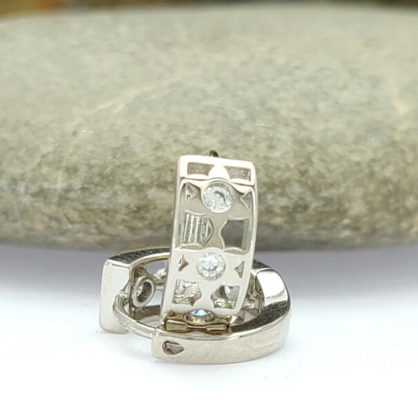 Ezüstszínű karika fülbevaló, melyet fehér cirkónia kristályok tesznek csillogóvá. A kristályok karmos foglalatban helyezkednek el. Időtálló darab, nem feketedik, nem színezi a bőrt ( "gold filled"). Antiallergén ékszer, nem okoz panaszokat fémérzékeny hölgyeknek sem. Fülbevaló szélessége: 5 mm. Karika belső átmérője: 10 mm. Az antiallergén ékszerek olyan fémötvöz
