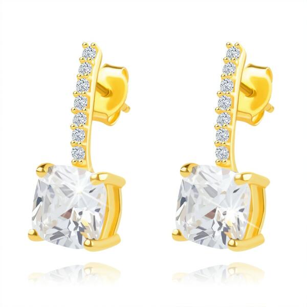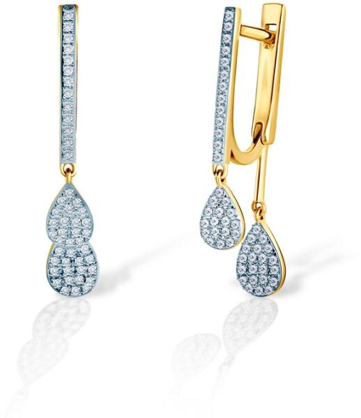 925 arany színű ezüst fülbevaló kerek, átlátszó cirkóniákkal kirakott vékony csíkból áll. A csíkhoz egy átlátszó cirkónia van rögzítve, amely négyágú négyszögletes tartóba van beágyazva. A fülbevaló stekkeres rögzítéssel rendelkezik. A fülbevaló mérete: 8 x 20 mmA fülbevaló súlya: 3,9 gFémjel – van. Az ár egy párra vonatkozik.