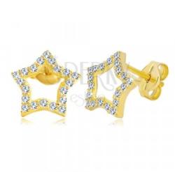 A 14K sárga arany fülbevalót ötágú csillag körvonala alkotja, amelyet beültetett csillogó kerek, átlátszó cirkóniák díszítenek. Biztonságos viselését stekker teszi lehetővé. Fülbevaló mérete: 9 x 8 mmFülbevaló súlya: 0,7 gFémjelzéssel ellátott. Az ár egy párra vonatkozik.