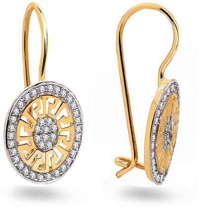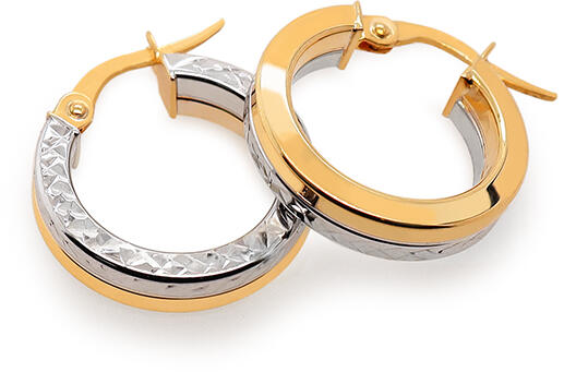 A kombinált 14K arany fülbevaló sárga aranyból készült ovális körvonalból áll. A közepén egy vékony, fehér arannyal díszített vonal húzódik. Az egyik oldalon egy csillogó, átlátszó, kerek alakú briliáns van elhelyezve. Biztonságos viselését stekker teszi lehetővé. Fülbevaló méretei: 5 x 7 mmEgy gyémánt átmérője: 1,5 mmGyémántok teljes súlya: 0,03 ctTisztas