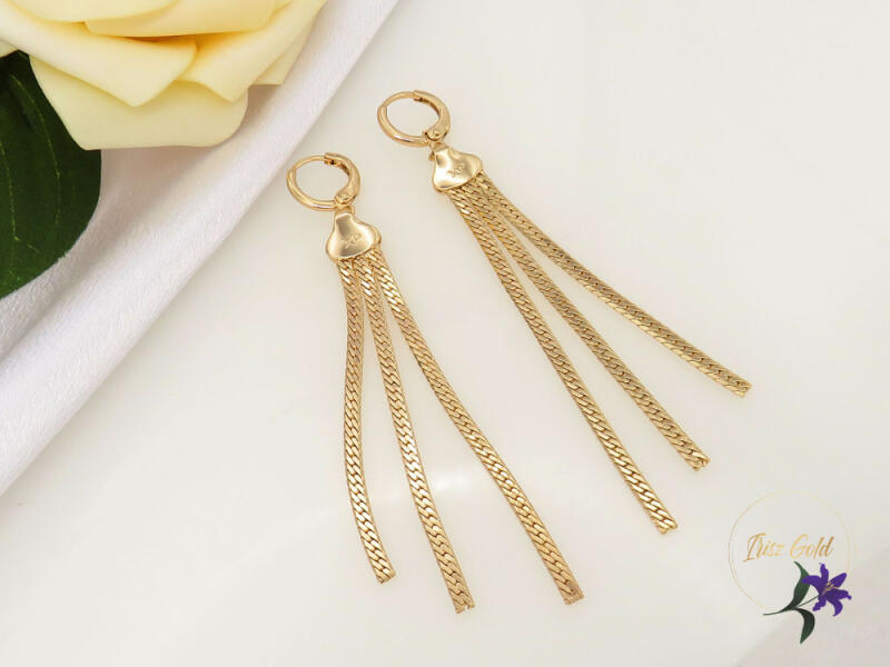 Antiallergén hosszú három szálas csüngős fülbevaló Szin: 18k aranyszínű Méret: 9cm csüngő szélessége 2mm Zár :karika 10mm A forgalmazott divatékszerek alapanyaga nikkel és ólommentes ezért többnyire nem okoznak allergiás tüneteket, nyugodtan hordhatják fémérzékeny emberek is. Általában nem színezik a bőrt és más divatékszerekhez képest nagyságrendekkel jobb kop
