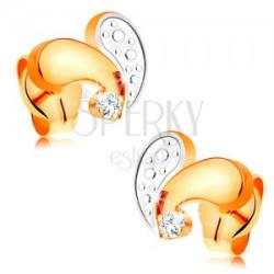14K kombinált arany fülbevaló, két hajlított könnycsepp alak. Az egyik fehér arany, apró pöttyökkel a felületén. A sárga arany rész felülete sima és fényes. Az alsó részen egy kerek cirkónia helyezkedik el. Biztonságos viselését stekker teszi lehetővé. Méretek: 7 x 6 mmSúly: 0,5 gFémjelzéssel ellátott. Az ár egy párra vonatkozik.