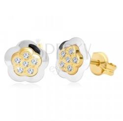 14K kombinált arany fülbevaló virág alak, gömbölyű szirmokkal. Középen enyhén kiemelkedő sárga arany rész mely hat átlátszó kerek cirkóniával van díszítve. A virág körvonala fényes és sima, fehér aranyból. Biztonságos viselését stekker teszi lehetővé. Fülbevaló mérete: 7 x 7 mmFülbevaló súlya: 0,4 gFémjelzéssel ellátott. Az ár egy párra vonatkozik.