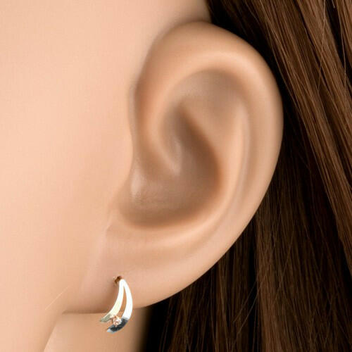 Fülbevaló 9K aranyból két fényes ívből, miközben az egyik sárga a másik pedig fehér aranyból készült. Az alsó részén kerek csillogó átlátszó cirkónia található. A fülbevaló felszíne ródiummal van ellátva. Biztonságos viselését stekker biztosítja. Fülbevaló mérete: 5 x 9 mmFülbevaló súlya: 0,3 gFémjelzéssel ellátott. Az ár egy párra vonatkozik. A ródiumm