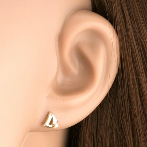 Fülbevaló 9K sárga aranyból egyenetlen háromszög körvonal alakban kétszínű kivitelezésben. A háromszög sarkában egy kerek, átlátszó cirkónia van ültetve. Biztonságos viselését stekker biztosítja. A fülbevaló méretei 6 x 6 mmA fülbevaló súlya 0,39 gFémjelzéssel ellátott. Az ár egy párra vonatkozik. A ródiummal kezelt felület az ékszer tartósságát, keménység