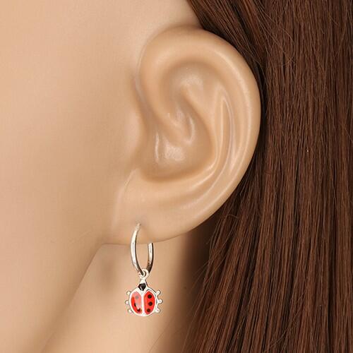 925 ezüst fülbevaló, egyszerű karika és függő katicák, amelyek egyhén domború formájúak. A páncélt piros zománc díszíti, mindkét oldalon három pettyel. A katica feje fekete zománc bevonattal készült. A fülbevaló felülete sima és fényes. A fülbevaló csőzáras, önmagába záródó. A karika szélessége: 1 mmKülső átmérő: 12 mmA díszes rész méretei: 8 x 10 mmA