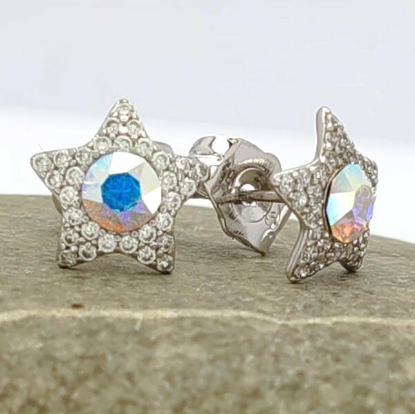 Csillogó színjátszós fehér Swarovski kristállyal díszített csillag formájú ezüstszínű fülbevaló. A tökéletes csillogásról sok apró, fehér kristály gondoskodik. A kristályok ragasztott, karmos foglalatban helyezkednek el. Időtálló ékszer, nem kopik, víz hatására nem feketedik. Antiallergén ékszer. Fülbevaló átmérője: 10 mm. Az antiallergén ékszerek olyan fém