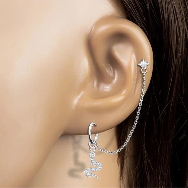 A kétlyukú fülbevalók 925 ezüstből készültek. Dupla fülbevalók, amelyeket ovális láncszemekből álló lánc köt össze. A fülbevalót egy tiszta vágású cirkónia díszíti, szögletes kosárba ágyazva, sima kivitelben. A vékony karikát egy lógó, kúszó kígyó sziluettje köti össze egy lánccal. A kígyó testét apró, átlátszó cirkóniával díszítik. A karika fülb