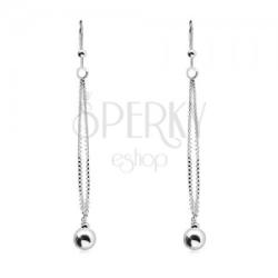 A 925 ezüst fülbevalót apró szögletes elemekből álló keskeny lánc alkotja, amely kerek alakú szemeken van duplán áthúzva. Alsó részéhez nagy tükörfényes felületű golyó van hozzá fogatva. A fülbevaló afrikai horgokon függ apró golyóval. Golyó átmérője: 8 mmFülbevaló teljes hossza (kapoccsal): 63 mmFülbevaló súlya: 2,3 gFémjelzéssel ellátott. Az ár egy párra
