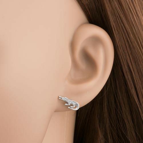 925 ezüst fülbevaló, részletesen kidolgozott krokodil gravírozott bőre és szeme. A felülete patinált és fekete színű. Biztonságos viselését stekker teszi lehetővé. Fülbevaló mérete: 14 x 5 mmSúly: 0,6 gFémjelzéssel ellátott. Az ár egy párra vonatkozik.