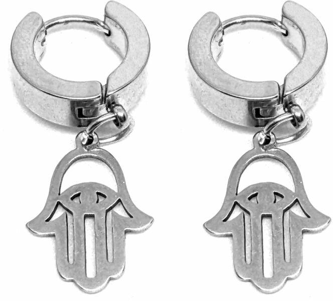 Nemesacél Fatima keze fülbevaló. Paraméterek: Med ál mérete kb. 1,4 cm. Anyaga nemesacél. Akasztó rozsdamentes acél.