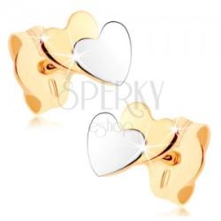 Fülbevaló 9K sárga aranyból kicsi, lapos szívek kettősével, amelyek részlegesen fedik egymást. Az egyik szív arany árnyalatú a másik felülete ródiummal kezelt és ezüst színű. Biztonságos viselését stekker biztosítja. A fülbevaló méretei: 5 x 5 mmA fülbevaló súlya: 0,3 gFémjelzéssel ellátott. Az ár egy párra vonatkozik. A ródiummal kezelt felület az ékszer tart