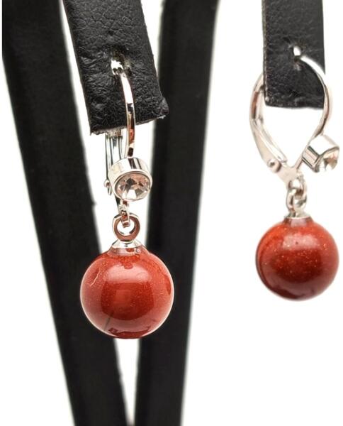 Goldstone fülbevaló (golyó záras strasszos vörös Ásvány fülbevaló) Egyedi ásvány ékszer.