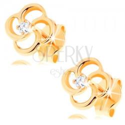 Fülbevaló 14K sárga aranyból virág alakban, mely négy csavart sziromkörvonalból áll. A virág közepébe apró kiálló átlátszó cirkónia található. A fülbevaló kapcsolása stekkeres. A fülbevaló mérete: 5 x 5 mmSúly: 0,3 gFémjelzéssel ellátott. Az ár egy párra vonatkozik.