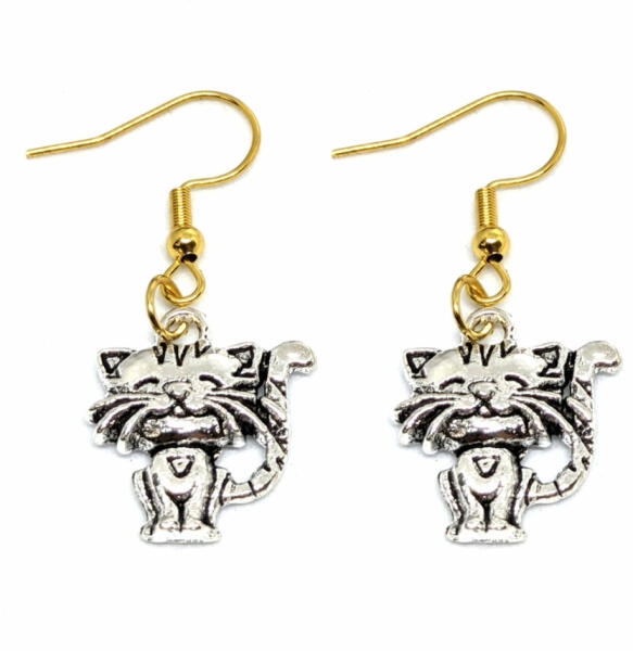 Boldog cica fülbevaló. Para méterek: A függő mérete 1,9x1,7 cm. A színe ezüst, anyaga fémötvöze t. Akasztó rozsdamentes acélból készült.