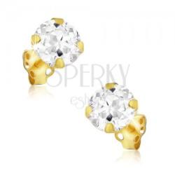 Arany beszúrós fülbevaló nagy kerek díszesen csiszolt átlátszó cirkóniával, mely négy lapos karommal megfogott fényes foglalatba van behelyezve. Biztonságos viselését stekker biztosítja. A fülbevaló mérete: 4 mmA fülbevaló súlya: 1,6 gAz ár egy párra vonatkozik. Fémjelzéssel ellátott.