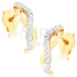 Fülbevaló 9K sárga aranyból két hullámos vonallal, amelyek az alsó részben félhold alakra hajlanak. A sima, fényes hullámon egy csillogó további hullám helyezkedik el átlátszó cirkóniákkal kirakva. A hátsó oldal üreges. Biztonságos viselését stekker biztosítja. A fülbevaló méretei: 3 x 10,5 mmA fülbevaló súlya: 0,7 gFémjelzéssel ellátott. Az ár egy párra vonatk