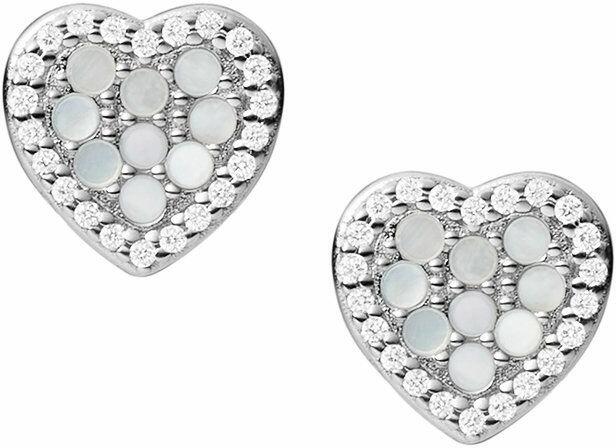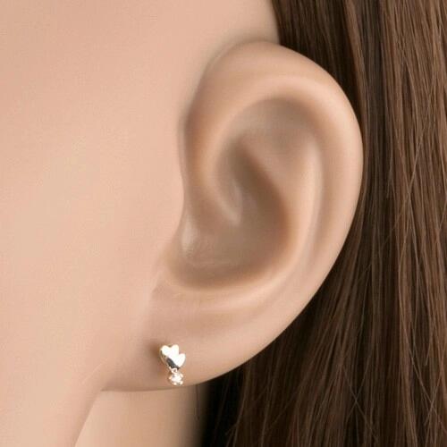 Fülbevaló 9K sárga aranyból kicsi lapos szívek kettősével, amelyek egymás részlegesen fedik. Az egyik szín arany a másik ezüst árnyalatú és ródiummal kezelt. Az alsó részben egy apró átlátszó cirkónia található foglalatban négy karommal. Biztonságos viselését stekker biztosítja. A fülbevaló méretei: 4 x 5,5 mmA fülbevaló súlya: 0,36 gFémjelzéssel ellátott. Az