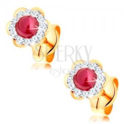 Fülbevaló 14K sárga aranyból kis virág alakban, mely közepébe piros kerek alakú rubin van beültetve sima domború felszínnel. A rubint apró csillogó átlátszó Swarovski kristályok szegélyezik. A virág szirmai fényesek és simák. A fülbevaló kapcsolása stekkeres. A fülbevaló mérete: 5 x 5 mmSúly: 0,4 gFémjelzéssel ellátott. Az ár egy párra vonatkozik.