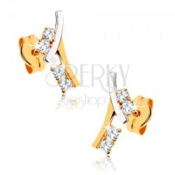 Ródiumozott fülbevaló 375 aranyból két enyhén ívelt vonalból sárga és fehér arany árnyalatban, mely kerek csillogó átlátszó cirkóniákkal díszített. Beszúrós kapcsolás. A fülbevaló méretei: 3 x 10 mm A fülbevaló súlya: 0,4 gFémjelzéssel ellátott. Az ár egy párra vonatkozik. A ródiummal kezelt felület biztosítja az ékszer tartósságát, nagyobb erősséget, mag