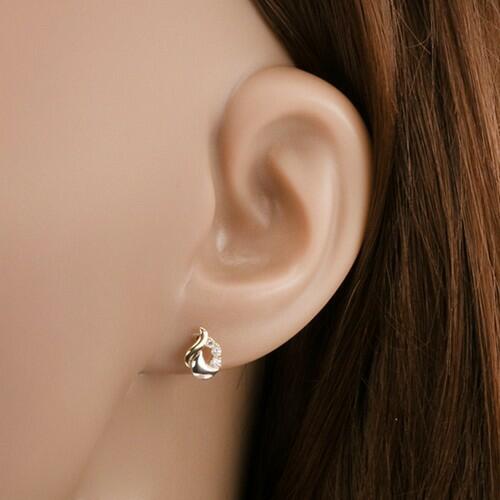 A 14K aranyból készült, briliáns fülbevalót egy könnycsepp alkotja, amelynek a felső, hullámos vonala sárga aranyból, az alsó hajlított része pedig fehér aranyból készült. Oldalt csillogó, átlátszó gyémántokkal kirakott sáv húzódik, miközben az egyik kisebb, a másik kettő pedig nagyobb. A könnycsepp közepén egy ovális kivágás található. Biztonságos viselésé
