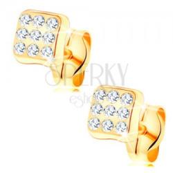 Fülbevaló 14K sárga aranyból apró fényes négyzettel, enyhén domború felszínnel. A négyzet kis kerek átlátszó cirkóniákkal van kirava. Beszúrós kapcsolás. A fülbevaló méretei: 4 x 4 mmSúly: 0,4 gFémjelzéssel ellátott. Az ár egy párra vonatkozik.