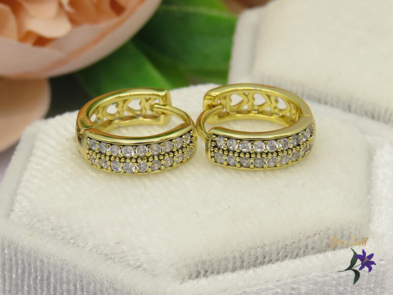 Gold Filled kiskarika fülbevaló apró cirkóna kövekkel díszítve Szi: 14K Méret: 13x4mm Zár: karika , belső átmérő 10 mm A forgalmazott divatékszerek alapanyaga nikkel és ólommentes ezért többnyire nem okoznak allergiás tüneteket, nyugodtan hordhatják fémérzékeny emberek is. Általában nem színezik a bőrt és más divatékszerekhez képest nagyságrendekkel jobb kopásáll