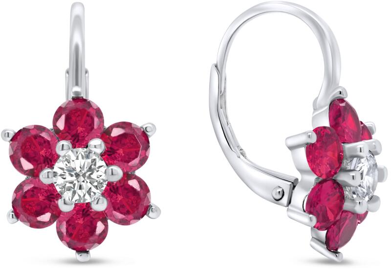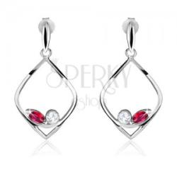925 ezüst fülbevaló fényes ovális alakú sima fejecskés beszúróval, melyhez egy lekerekített rombusz körvonal van hozzáfogva. A rombusz belső oldala könnycsepp alakú, háromszög résszel az alsó részén. A könnycseppkörvonalat egymás mellet elhelyezett átlátszó kerek és szemecskés ciklámen színű cirkónia díszít. Biztonságos viselését stekker biztosítja. Méretek: