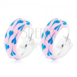 925 ezüst fűlbevaló félkör alakban, amely felületén kidomborodó fénymáz található, rózsaszín színben kék szívecskékkel. Biztonságos viselését a zárszerkezete teszi lehetővé. Szélesség: 4 mmKülső átmérő: 15 mmBelső átmérő: 12 mmSúly 1,1 gFémjelzéssel ellátottAz ár egy párra vonatkozik.