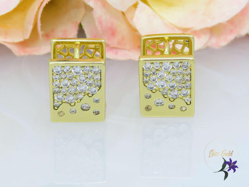 Gold Filled modern egyedi fülbevaló , apró cirkóna kövekkel díszített négyzetes fülbevaló Szin: 14K Méret: 10x10x8mm A forgalmazott divatékszerek alapanyaga nikkel és ólommentes ezért többnyire nem okoznak allergiás tüneteket, nyugodtan hordhatják fémérzékeny emberek is. Általában nem színezik a bőrt és más divatékszerekhez képest nagyságrendekkel jobb kopásállós