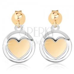 Fülbevaló 9K aranyból kicsi golyó alakban, amely alatt egy fényes körvonal függ fehér aranyból. A körvonalban egy matt, egyenletes szív helyezkedik el sárga aranyból fényes kerettel. A fülbevaló biztonságos viselését stekker biztosítja. A fülbevaló méretei: 9 x 13,5 mmA fülbevaló súlya: 0,6 gFémjelzéssel ellátott. Az ár egy párra vonatkozik.