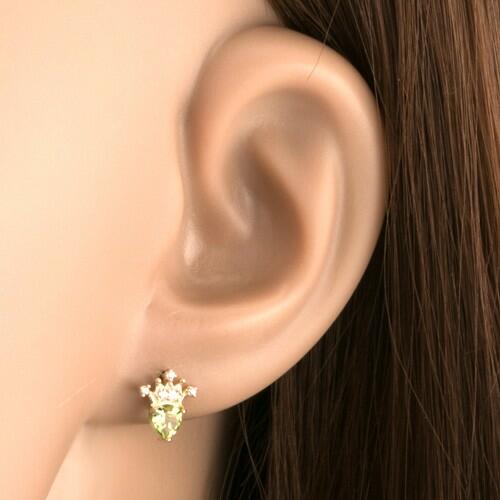 Korona alakú 9K sárga színű arany fülbevaló, amelynek a felső része kerek, átlátszó cirkóniákkal van kirakva és alatta világoszöld árnyalatú, csiszolt olivin szívvel van díszítve. Biztonságos viselését a stekker biztosítja. A fülbevaló méretei: 7 x 9 mmA fülbevaló súlya: 0,6 gFémjelzéssel ellátott. Az ár egy párra vonatkozik.