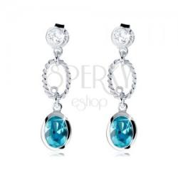 925 ezüst fülbevaló, amely hengerből áll kerek, átlátszó kővel, amelyen egy ovális kontúr függ tekert vonalakkal. A kontúron egy kék cirkónia van keresztülfűzve szintén ovális alakban, díszesen kivágott foglalatba helyezve. Biztonságos viselését stekker biztosítja. Méretek: 6,5 x 25 mmA fülbevaló súlya: 2,6 gFémjelzéssel ellátott. Az ár egy párra vonatkozik.
