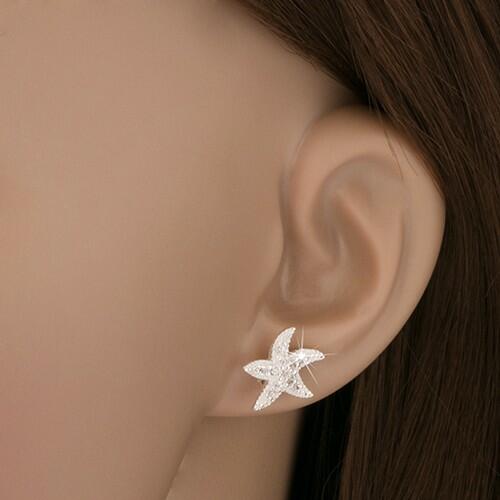Fülbevaló 925 ezüstből, a fejecske alakja tengeri csillag, mely testébe kicsi csiszolt átlátszó kövek vannak beültetve. A fülbevaló kapcsolása beszúrós. Méretek: 13 x 12 mm A fülbevaló súlya: 1,5 g Fémjelzéssel ellátott. Az ár egy párra vonatkozik.