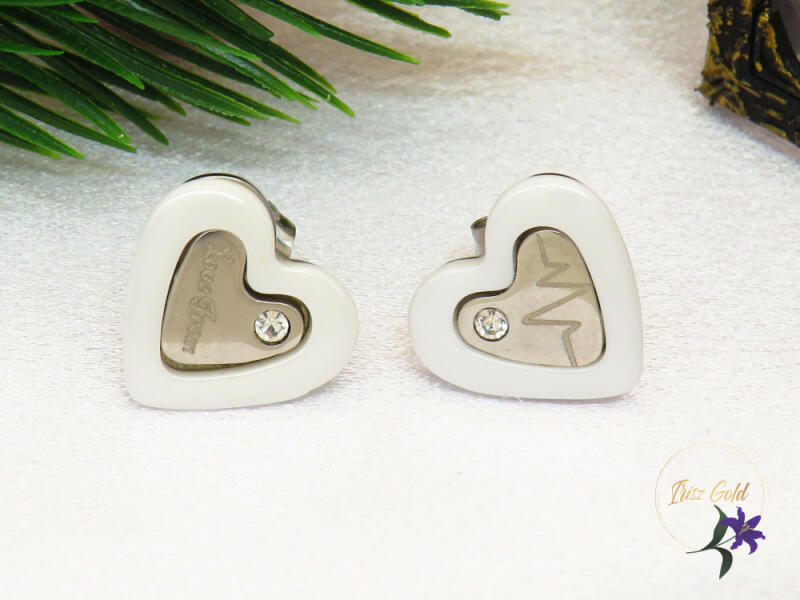Antiallergén nemesacél kerámia fülbevaló Szív alakú benne pici kő EKG-jel és "love from " felirat Szin:rodium Méret: 12x15 mm Bedugós A forgalmazott divatékszerek alapanyaga nikkel és ólommentes ezért többnyire nem okoznak allergiás tüneteket, nyugodtan hordhatják fémérzékeny emberek is. Általában nem színezik a bőrt és más divatékszerekhez képest nagyságrendekkel jo