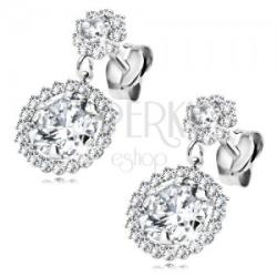 A fehér 14K arany fülbevaló két csillogó virágból áll. A kisebb virág alatt egy nagyobb függ. Mindkettőt egy átlátszó cirkónia alkotja középen, amelyet apró, kerek, átlátszó cirkóniákból álló szirmok szegélyeznek. Biztonságos viselését stekker teszi lehetővé. Fülbevaló méretei: 9 x 16 mmFülbevaló súlya: 1,7 gFémjelzéssel ellátott. Az ár egy párra vonatkoz