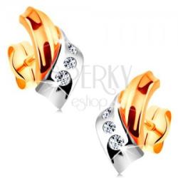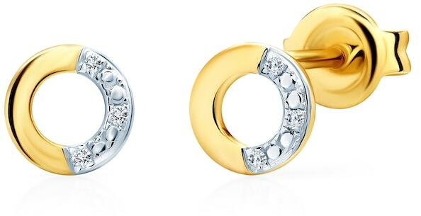 A 14K arany fülbevalót két, egymást keresztező ív alkotja. A felső, fehér aranyból készült vonalat apró, kerek, átlátszó cirkóniákból álló sáv díszíti. Az alsó ív arany árnyalatú, míg teljes hosszában középen hajlított. Stekkeres kapcsolás. Fülbevaló méretei: 5 x 11 mmFülbevaló súlya: 0,6 gFémjelzéssel ellátott. Az ár egy párra vonatkozik.