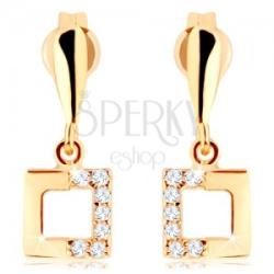 Fülbevaló 9K sárga aranyból csillogó négyzet kontúrból vékony fordított könnycseppre függesztve. A körvonal egyik fele sima és fényes a másik pedig élénk, átlátszó cirkóniákkal van kirakva. Biztonságos viselését stekker biztosítja. A fülbevaló méretei: 6 x 14 mmA fülbevaló súlya: 0,81 gFémjelzéssel ellátott. Az ár egy párra vonatkozik.
