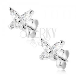 Bedugós, stekkeres fülbevaló 925 ezüstből pillangó alakban, mely négy darab csiszolt átlátszó cirkóniából tevődik össze. A fülbevaló méretei:7 x 6 mm A fülbevaló súlya:0,8 gAz ár egy párra vonatkozik. Fémjelzéssel ellátott.