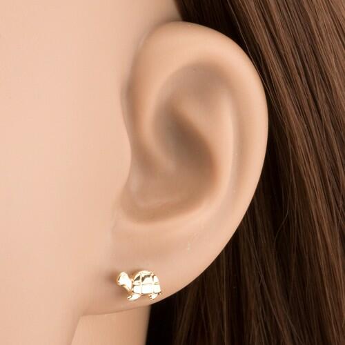 14K sárga arany fülbevaló, apó teknősbéka alakban fénylő felülettel. A páncél szerkezete részletei gravírozottak. Biztonságos viselését stekker teszi lehetővé. Méret: 9 x 5 mmSúly: 0,4 gFémjelzéssel ellátott. Az ár egy párra vonatkozik.