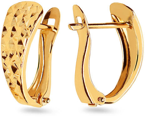 Elegáns fülbevalók, amelyek alkalmasak minden nő számára, aki lépést kíván tartani a divattal. Atipikus forma alkotja őket, amely a felső részén kiszélesedik. Fenomenális megjelenésüket precíz, tündöklő, kereszt alakú gravírozás díszíti, ami megsokszorozza a sárga arany szépségét. A biztonságos és kényelmes viselés garanciája az alkalmazott angol patentos zár.