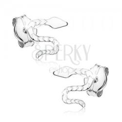 Fülbevaló 9K fehér aranyból hullámos kígyó alakban. A feje sima és tükörfényű, a teste gravírozott. Biztonságos viselését stekker biztosítja. A fülbevaló méretei:7 x 6 mm A fülbevaló súlya: 0,4 g Fémjelzéssel ellátott. Az ár egy párra vonatkozik.