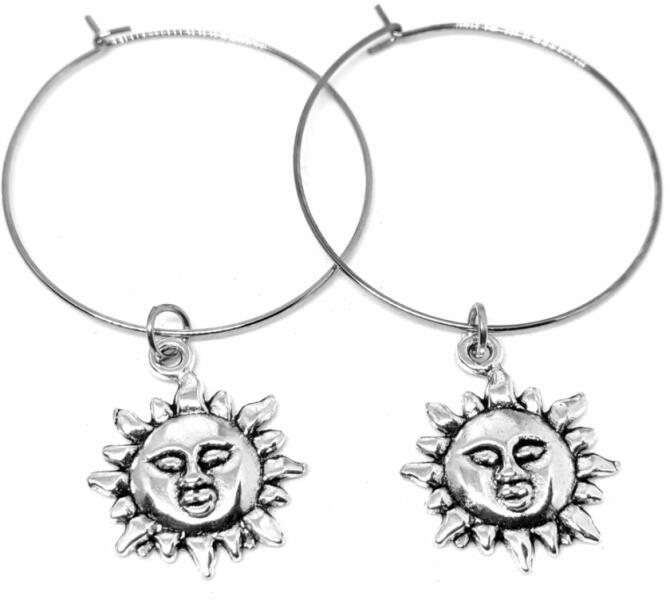 Napocska fülbevaló. Karika átmérője 3,5 cm. Paraméterek: A függő mérete 2,1x1,7 cm. A színe ezüst, anyaga fémötvöze t. Akasztó rozsdamentes acél.