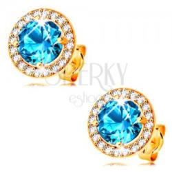 Az 585 arany fülbevaló karika alakú, amelynek a kerülete csillogó, átlátszó cirkóniákkal van kirakva. Középen egy nagy, kerek, szintetikus akvamarin található, négy pálcával rögzítve. Stekkeres kapcsolás. Fülbevaló átmérője: 9 mmFülbevaló súlya: 1,3 gFémjelzéssel ellátott. Az ár egy párra vonatkozik.
