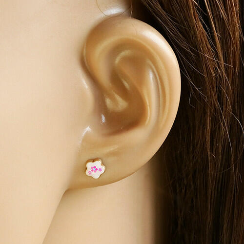 A 14 sárga arany fülbevaló egy szimmetrikus, fehér fénymázzal borított virágból áll, amelyet rózsaszín virágok díszítenek. A virágok közepe kék színű. A virágszirmokat fényes és sima vonal szegélyezi. Stekkeres zárszerkezet. A fülbevaló mérete: 6 x 6 mmA fülbevaló súlya: 0,4 gFémjelzéssel ellátva. Az ár egy párra vonatkozik.