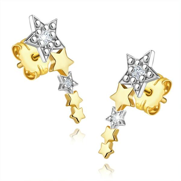 A 14K kombinált arany fülbevaló egy ívből áll, fokozatosan csökkenő csillagokkal. A csillagok egy része sima és fényes felületű, a másik részét középen egy kerek tiszta cirkóniák és apró fehérarany pöttyök díszítik. A fülbevaló stekkeres rögzítéssel rendelkezik. A fülbevaló mérete: 14 x 5,5 mmA fülbevaló súlya: 0,80 gFémjelzés - van. Az ár egy párra vonatk