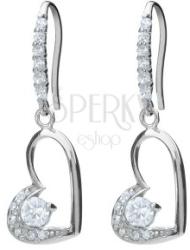 Ezüst függő fülbevaló, mely cirkóniaköves akasztóból és szívből tevődik össze. Az akasztó felülete tiszta, ragyogó kövekkel van kirakva. Az akasztóhoz a szív fektetve van fogatva. A ferde szívecske bal oldalán szintén ragyogó köveket találunk. A belsejében egy nagyobb, kerek, tiszta cirkónia díszeleg. A szív méretei: 10 x 15 mmA cirkónia átmérője: 4 mmA fülbeval