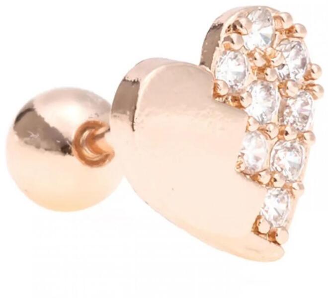Heart piercing fülbevaló Heart piercing fülbevaló verhetetlen áron. Nem tartalmaz sem nikkelt, sem ólmot, sem kadmiumot. Az ár 1db fülbevalóra érvényes - egy fülbe való! A fülbevalónak csavaros zárszerkezete van. Tulajdonságok: A fülbevaló mérete: 0,8cm Csomagolás: 1db Anyaga: Nemesacél Szín: RózsaArany
