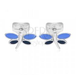 Az 585 fehér arany fülbevaló lapos, repülő szitakötő alakú, amelynek teste enyhén meghajlított és felülete fényes. A szárnyait fénymáz fedi világos és sötétkék színben. Biztonságos viselését stekker teszi lehetővé. Fülbevaló méretei: 8 x 5 mmFülbevaló súlya: 0,4 gFémjelzéssel ellátott. Az ár egy párra vonatkozik.