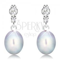 A fehér 14K arany fülbevalót három átlátszó cirkóniából álló, egyenes, csillogó sáv alkotja, amely alatt egy szürke színű, ovális alakú, tenyésztett gyöngy függ. Biztonságos viselését stekkert teszi lehetővé. Fülbevaló méretei: 8 x 20 mmFülbevaló súlya: 2,4 gFémjelzéssel ellátott. Az ár egy párra vonatkozik. A tenyésztett gyöngy apró idegen anyag behelyezé